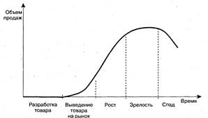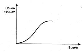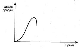 Теория жизненного цикла товара выделяет общую для всех товаров закономерность, которая выражается в виде S-образной кривой изменения объема продаж товара с течением времени (рис. 1). Динамика изменения объема продаж характеризуется сначала медленным, затем бурным ростом, далее объем продаж стабилизируется и в заключение падает.
