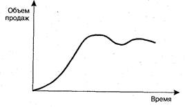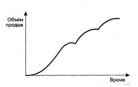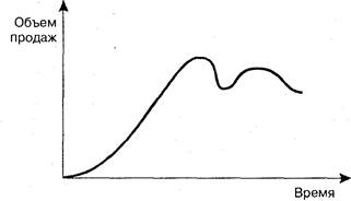 Кривая «с повторным циклом» является одним из часто встречающихся вариантов (см. рис. 2). Второй всплеск объема сбыта вызывается мероприятиями по стимулированию, проведенными на этапе спада товара.