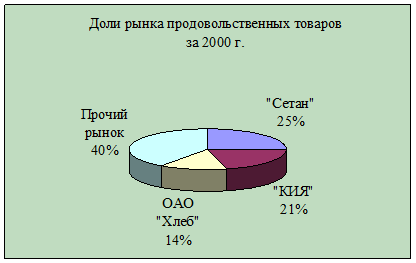 Анализируя график (рис. 2.1.) можно сказать, что рынок продовольственных товаров в значительной мере зависит от поведения трех его основных участников: ТД «Сетан», ТД «КИЯ» и ОАО «Хлеб» - им принадлежит около 60% рынка (учитываются, как розничные продажи, так и оптовые).