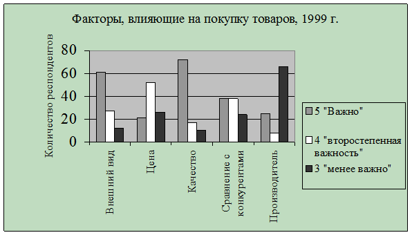 Торговые точки основных конкурентов оценивались по пятибалльной системе с учетом важности оцениваемого параметра. Наиболее высокая оценка говорит об эффективности использования оцениваемого параметра и об общем впечатлении от него. Ограничение данного метода заключается в субъективности оценивающего лица, тем не менее подобные оценки помогают выявить слабые и сильные стороны фирмы и ее конкурентов. Оценка проводилась в 1999 г. и в 2000 г., ниже приведен пример простой оценки торговых точек, без коэффициентов значимости за 1999-2000 г.