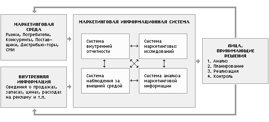 Чтобы принять любое управленческое решение - от изменения цен до открытия новой торговой точки необходима информация. Как правило, для удовлетворения информационной потребности проводятся маркетинговые исследования. Однако решения принимаются постоянно, следовательно, информация для их принятия также требуется постоянно, а маркетинговые исследования проводятся через довольно длительные промежутки времени. В то же время, в распоряжении компании зачастую находится почти вся необходимая информация, просто она не систематизирована и не готова к использованию. Упорядочить и подготовить к использованию эту информацию можно с помощью внедрения маркетинговой информационной системы (МИС), которая представляет собой алгоритм, позволяющий регулярно собирать необходимую для принятия решений информацию из различных внешних и внутренних источников, и передавать ее заинтересованным лицам.