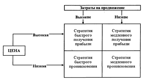 Каждая из указанных стратегий подлежит дальнейшей детализации. Так, стратегия проникновения на рынок с новым товаром может быть конкретизирована с помощью матрицы "цена товара - затраты на продвижение".