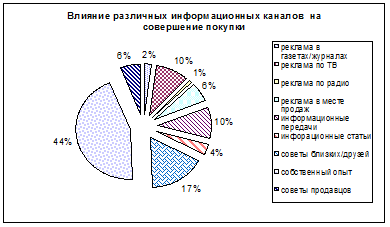 На основе опроса, потребителей при совершении покупки молочной/кисломолочной продукции в большей степени влияет телевидение – реклама (10%) и информационные передачи о полезности и важности употребления той или иной продукции (10%), но в основном потребители основываются на собственный опыт (44%) и советы близких/друзей (17%). Также в значительной степени влияют реклама в месте продажи (6%) и советы продавцов (6%). Лишь немногие обращают внимание на информационные статьи о полезности и важности употребления той или иной продукции, рекламу в газетах/журналах, рекламу по радио: