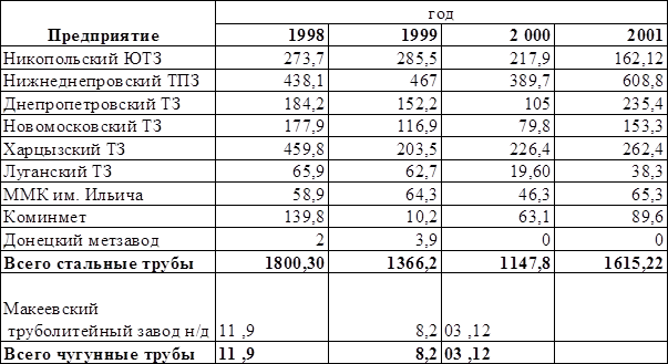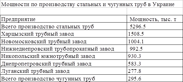 диаметром 83-203 мм, холоднодеформированные углеродные трубы диаметром 95-130 мм, обсадные трубы диаметром 168-325 мм; Никопольский Южнотрубный завод - трубы коррозийно-стойкие, катанные и прессованные диаметром 76-325 мм, холоднодеформированные трубы из коррозийно-стойкой стали диаметром 30-89 мм; Днепровский трубный завод - электросварочные трубы диаметром 127-152 мм; Макеевский труболитейный завод - чугунные литые трубы.