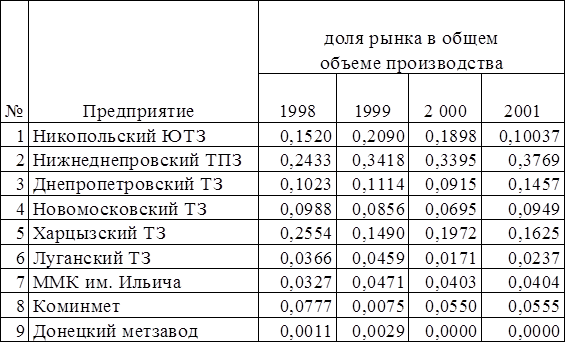 Таблица 2.3- Доля рынка производителей стальных труб Украины