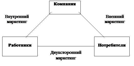 Внутренний маркетинг ( internal marketing ). Маркетинг организации сферы услуг, используемый для обучения и эффективной мотивации сотрудников, непосредственно контактирующих с клиентами, а также подготовка всего обслуживающего персонала к работе в команде и обеспечению удовлетворения потребителя.