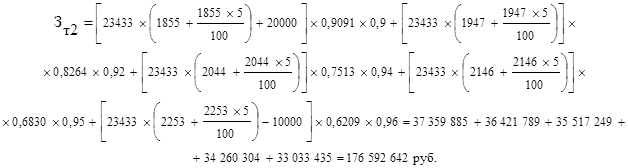 где tн - начальный год расчетного периода; tк - конечный год расчетного периода; t- год, затраты и результаты которого приводится к расчетному году; Цу - цена реализации услуг; аt - коэффициент приведения одновременных затрат и результатов к расчетному году; ки - коэффициент, учитывающий инфляцию по годам расчетного периода; Nу - программа выпуска услуг в год, предыдущему расчету (Nу = 1 855 услв.)