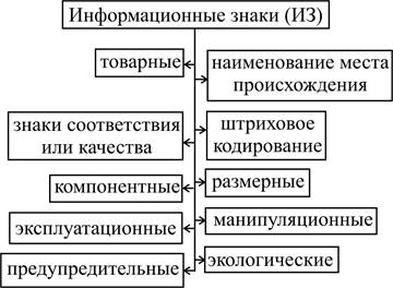 К информационным знакам относятся товарные знаки, знаки соответствия или качества, манипуляционные, предупредительные, размерные, знаки наименования мест происхождения товара, эксплуатационные, экологические.