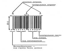 Штриховой код представляет собой чередование темных (штрихов) и светлых (пробелов) полос разной ширины. За единицу ширины принимается модуль – самый узкий штрих, или пробел (ширина – 0,33 мм). Каждая цифра кодируется семью модулями, которые сгруппированы в два штриха и два пробела. Например, цифра 4 представлена как 1011100 (семь модулей, но два штриха и два пробела). Ширина штрихов и пробелов – от одного до трех модулей.