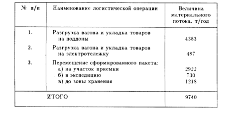 Объем работ по отдельной операции, рассчитанный за определенный промежуток времени, за месяц, за квартал, представляет собой материальный поток по соответствующей операции. Например, материальный поток по разгрузке вагонов и укладке товаров на поддоны для торговых оптовых баз складской площадью 5 тыс. кв. м. по проекту составляет 4383 т.