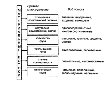 Материальные потоки подразделяют по следующим основным признакам: отношению к логистической системе, натурально-вещественному составу потока, количеству образующих поток грузов, удельному весу образующего поток груза, степени совместимости грузов, консистенции грузов.