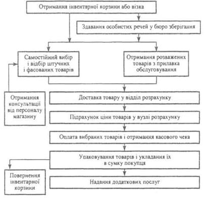 Самообслуговування — це прогресивний метод продажу, при якому покупці мають вільний доступ до всіх товарів, відкрито викладених у торговому залі магазину на пристінному та острівному обладнанні, і повну можливість самостійно оглядати і вибирати товари без допомоги продавця, а оплачувати покупки у вузлі розрахунку, розташованому при виході з торгового залу магазину.