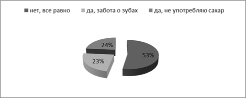 На диаграмме видно что большинство респондентов не обращают внимание на наличие сахара в жевательной резинке (53%) и с отличим в один процент для потребителя важен состав жевательной резинки, так как 23% заботятся о здоровье зубов и 24% не употребляют сахар в пищу в силу каких-либо причин.