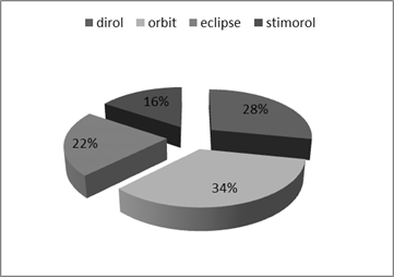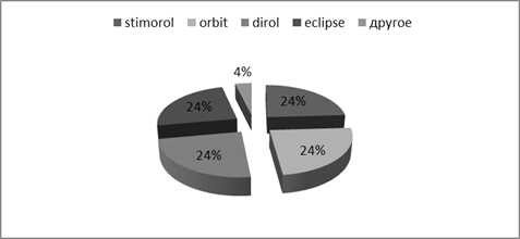 Диаграмма показала, что 34% испытуемых чаще всего употребляют жевательную резинку «Orbit», 28% - «Dirol», наименьшим успехом пользуются жевательные резинки «Eclipse»(22%) и «Stimorol»(16%).
