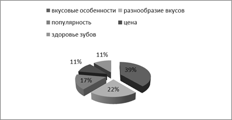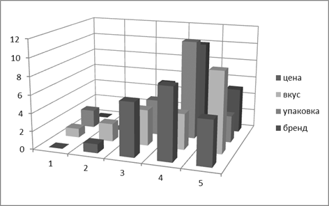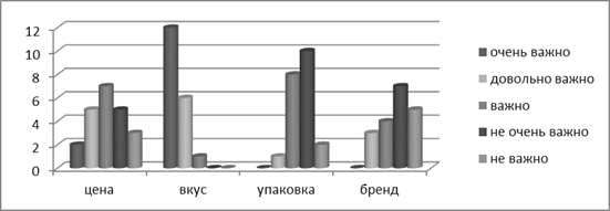 На диаграмме видно, что при выборе жевательной резинки респондент, прежде всего, обращает на ее вкусовые особенности, затем на то, как оформлена упаковка и менее всего потребителя интересует бренд.