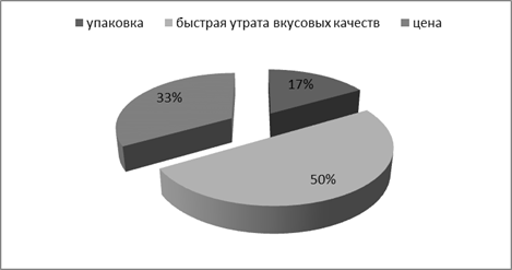 В ходе опроса 50% респондентов ответили, что их не устраивают быстрая, 33% утрата вкусовых качеств, 33% ответили, что качество продукции не соответствует цене, 17% не устраивает внешний вид продукции.