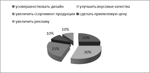 В результате опроса определились основные направления улучшения продукции. Респонденты в первую очередь предложили улучшить вкусовые качества продукции, усовершенствовать дизайн, повысить ассортимент, сделать приемлемую цену и увеличить рекламу.