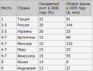 Это также приводит к искажению официальных данных, касающихся общемировых затрат на проведение маркетинговых исследований, так как они не учитывают расходы фирм, осуществляющих изучение рынков своими силами. Учитывая эти погрешности все же можно дать общую картину, по данным отчета Европейского общества исследователей рынка и общественного мнения (ESOMAR) , посвященного состоянию мирового рынка маркетинговых исследований в 2005 году. ESOMAR оценила объемы рынка: где по темпам роста лидирует Турция (22%), но по обороту рынка лидирует Мексика – 332 млн. долл.