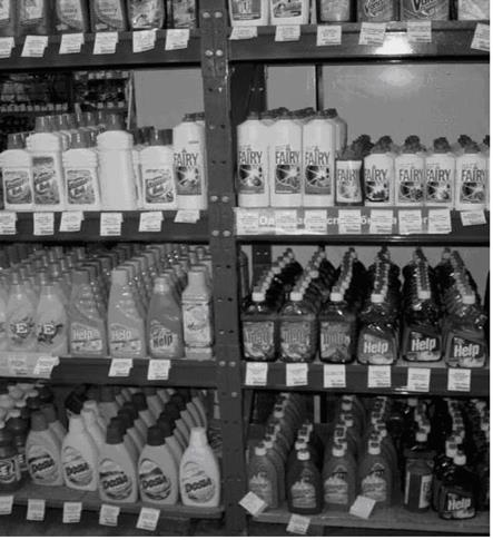 На полках с бытовой химией тоже неправильно размещен товар. Желательно, произвести следующие действия: А (дорогой товар) надо переместить на место В (на уровень глаз); Б можно оставить на месте, только повернуть лицевой стороной к покупателю; В, Д и З (пользующийся повышенным спросом товар) можно переставить на место Ж (уровень пола); а Ж (неизвестный и недорогой товар) в свою очередь на полку выше (место Д – уровень рук); товар на полках Г и Е можно оставить на своем месте.