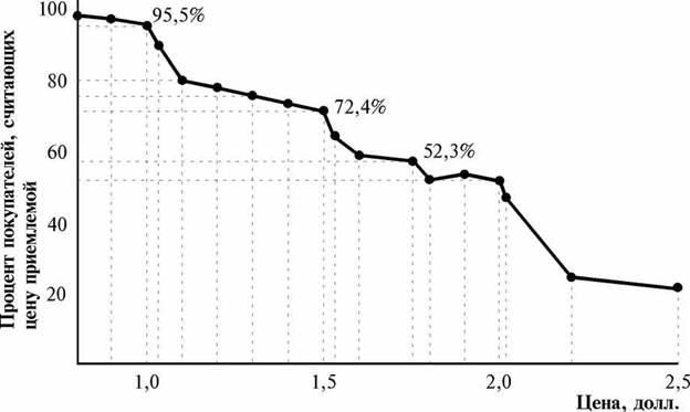 Большой интерес представляет построение кривой спроса и нахождение на ней ключевых точек для нового товара. Так, в работе [4] приводятся результаты опроса покупателей у дверей универмага Kmart относительно покупки новой продуктовой воронки. Им задавался вопрос: «Какова максимальная цена, которую вы заплатили бы за данный товар?» Сначала каждому покупателю были продемонстрированы другие воронки, имеющиеся в продаже в данном универмаге, по цене в 2,99 и 4,99 доллара. Как видно из графика на рис. 2, скачок кривой спроса имел место в ценовых точках при цене за воронку в 0,99, 1,49 и 1,99 доллара.