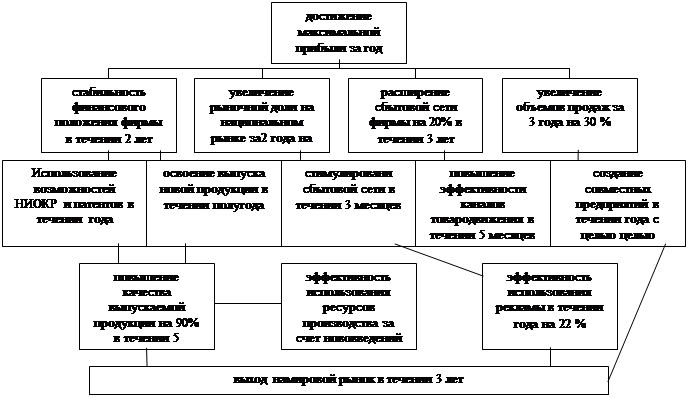 Программу фирмы необходимо развернуть в подробный перечень вспомогательных целей и задач для каждого эшелона руководства. Перед каждым управляющим должны быть поставлены задачи, за решение которых он несет ответственность. В качестве иллюстрации возьмем фирму «Русский стиль» занимающуюся производством (пошивом) джинсовых изделий. Фирма по выпуску джинсовых изделий не заявляет, что программа ее деятельности – это производство джинсовых изделий. Вместо этого она провозглашает своей программой удовлетворение спроса потребителя в данном виде товаров. Объем продаж можно–повысить благодаря созданию новых моделей джинсовой одежды, т.е. увеличением ассортимента, сулящих увеличение производства изделий. Однако исследование стоит дорого и стоит роста прибыли, отчисления от которой пошли бы на дополнительное финансирование изыскательских работ. Таким образом, основной задачей становится обеспечение роста прибыли.