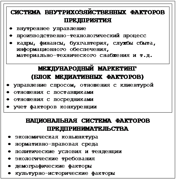 Внутренняя среда фирмы, ее внешнее микро- и макроэкономическое окружение на зарубежных рынках, а также принципы и методика проведения международно-маркетинговой политики образуют ткань внешне экономической предпринимательской деятельности, лежат в основе соответствующей многообразной практической работы.