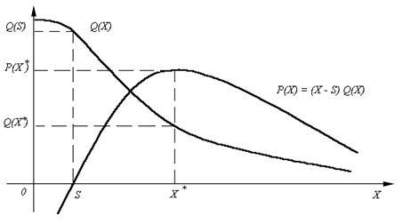 Рисунок 1 Оптимальная цена продажи при экспоненциальном спросе.
