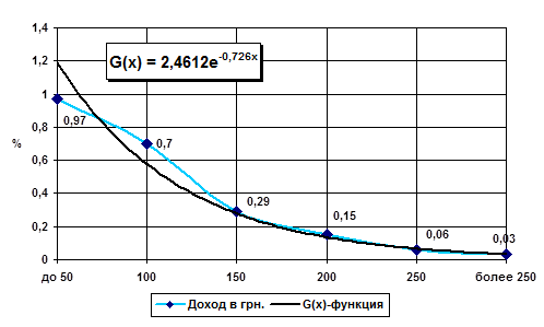 Рисунок 2 G(x) - хвост функции распределения доходов жителей города Киев осенью 1997 г.