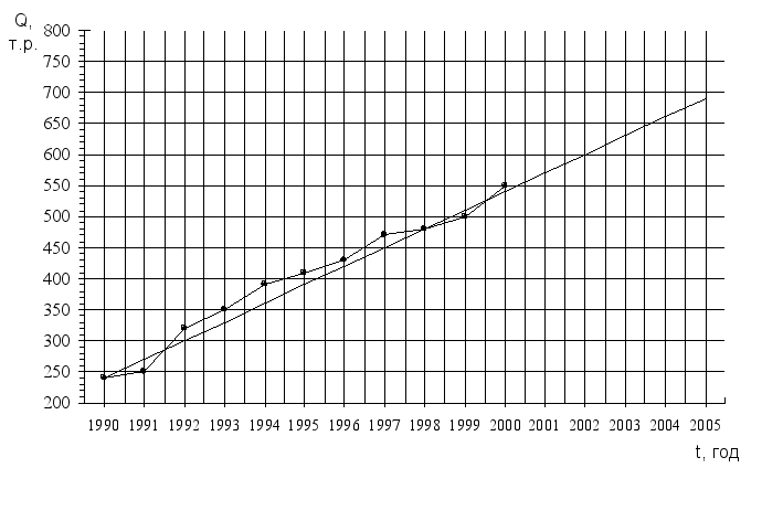 У предприятия имеются ретроспективные данные об объемах производства за 1990 – 2000 годы. Требуется определить ожидаемый объем производства в 2005 году.