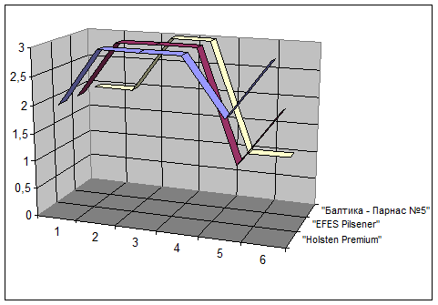 пиво ”EFES Pilsener” и ”HolstenPremium” попадают в поле отличной оценки, в то время как ”Балтика - Парнас № 5” может быть оценена только на «Хорошо».
