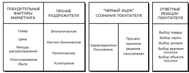 На рис. 2 эта же модель представлена в развернутом виде. В левом прямоугольнике - побудительные факторы двух типов. Побудительные факторы маркетинга включают в себя четыре элемента: товар, цену, методы распространения и стимулирования. Прочие раздражители слагаются из основных сил и событий из окружения покупателя; экономической, научно-технической, политической и культурной среды. Пройдя через "черный ящик" сознания покупателя, все эти раздражители вызывают ряд поддающихся наблюдению покупательских реакций, представленных в правом прямоугольнике: выбор товара, выбор марки, выбор дилера, выбор времени покупки, выбор объема покупки.