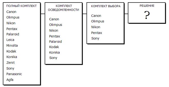 В результате сбора информации повышается осведомленность потребителей об имеющихся на рынке марках и их свойствах. До начала сбора информации Петрова знала только несколько марок фотокамер из полного комплекта доступных потребителю фотоаппаратов (см. крайний левый прямоугольник на рис. 6). Знакомые ей марки камер составляли ее комплект осведомленности. Вновь поступающая информация расширила рамки этого комплекта, а дополнительная информация помогла отсеять ряд марок из числа рассматриваемых. Оставшиеся марки, которые отвечали ее покупательским критериям, составили комплект выбора. Из этого комплекта Лена и сделает свой окончательный выбор.