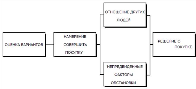 Оценка вариантов ведет к ранжированию объектов в комплекте выбора. У потребителя формируется намерение совершить покупку, причем наиболее предпочтительного объекта. Однако на пути от намерения до принятия решения в дело могут вмешаться еще два фактора (рис. 7).