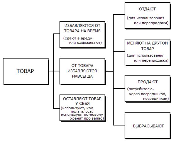 Если потребитель приспособит товар для использования в каких-то новых целях, продавец, должен заинтересоваться, поскольку цели эти можно обыграть в рекламе. Если потребители откладывают товар про запас, почти не пользуются им или избавляются от него, это означает, что товар не очень удовлетворяет их и что благоприятная молва в его пользу будет не слишком активной. В равной мере интересно и то, как потребитель избавится от товара. Если он продаст его или совершит с ним товарообменную сделку, это снизит объем продаж новых товаров.