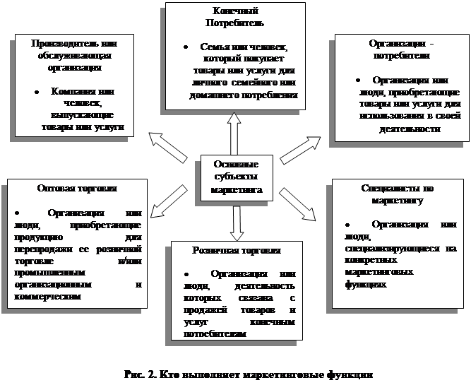 Субъекты маркетинга включают производителей и организации обслуживания, оптовые и розничные торговые организации, специалистов по маркетингу и различных потребителей. Как показано на рисунке 2, у каждого из них своя роль. Важно отметить, что хотя ответственность за выполнение маркетинговых функций может делегироваться и распределяться различными способами, совсем ими в большинстве случаев пренебречь нельзя, они должны обязательно кем-то выполняться.