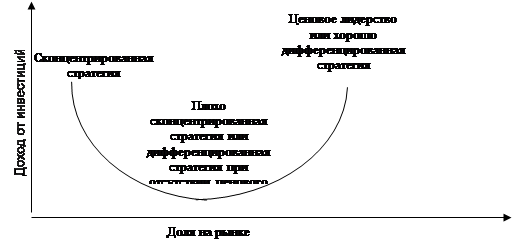 Согласно модели Портера зависимость между долей на рынке и прибыльностью носит U - образный характер, как показано на рисунке 13,. фирма с небольшой долей рынка может преуспеть посредством разработки четко сконцентрированной стратегии. Компания, имеющая большую долю рынка, может преуспеть в результате преимущества по общим издержкам или дифференцированной стратегии. Однако компания может "завязнуть в середине", если она не располагает эффективной и уникальной продукцией или преимуществам по общим издержкам. В отличие от матрицы "Бостон консалтинг груп" и программы PIMS согласно модели Портера небольшая фирма может иметь прибыль, концентрируясь на какой-либо одной конкурентной "нише", даже если ее общая доля на рынке будет незначительной. Фирме не обязательно быть большой, чтобы иметь хорошие показатели.