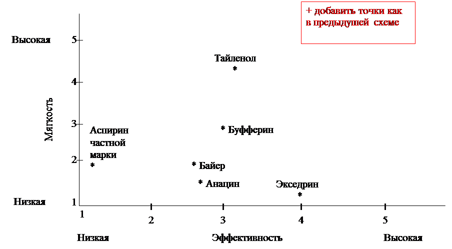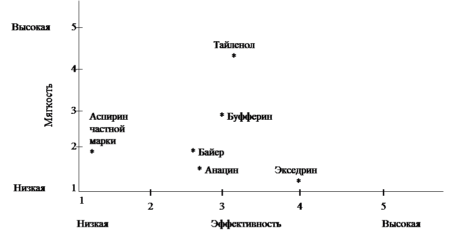 В-третьих , позиции марок соответствуют скорее восприятию ях потребителями, а не их действительным свойствам. Экседрин может обладать и недостаточно мягким действием, но главное не это, а то, как воспринимают его покупатели. (При желании можно составить еще одну схему на основе объективных характеристик марок.)