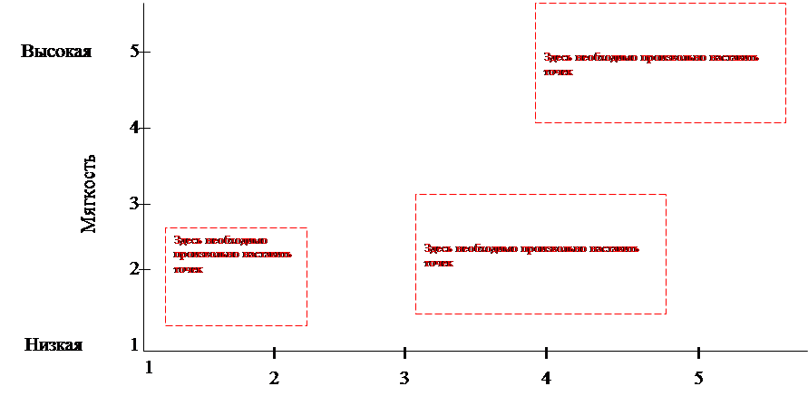 После этого фирма должна выяснить, чего именно с точки зрения основных свойств хотят от товара потребители. Их могут попросить описать уровень эффективности, мягкости, стоимости, быстроты действия и прочих характеристик, которые они хотели бы видеть в препарате и за которые они были бы готовы платить свои деньги. Мнение каждого потребителя об идеальном сочетании свойств можно изобразить в виде точки на схеме того же типа, о котором шла речь ранее. Только в этом случае она будет называться схемой потребительских предпочтений. На Таблице № 7 показан возможный разброс предпочтений в отношении двух исследуемых свойств болеутоляющих.