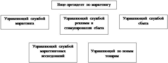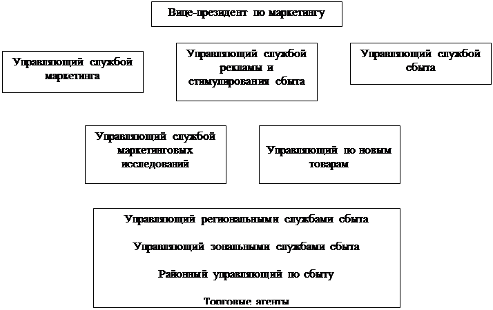 Функциональная организация. Самой распространенной схемой является функциональная организация службы маркетинга. В этом случае специалисты по маркетингу руководят разными видами (функциями) маркетинговой деятельности. Они подчиняются вице-президенту по маркетингу, который координирует их работу. В таблице № 9 представлены пять таких специалистов: управляющий службой маркетинга, управляющий службой рекламы и стимулирования сбыта, управляющий службой сбыта, управляющий службой маркетинговых исследований и управляющий по новым товарам. Кроме них, могут быть еще управляющий службой сервиса для клиентов, управляющий службой планирования маркетинга и управляющий службой товародвижения.