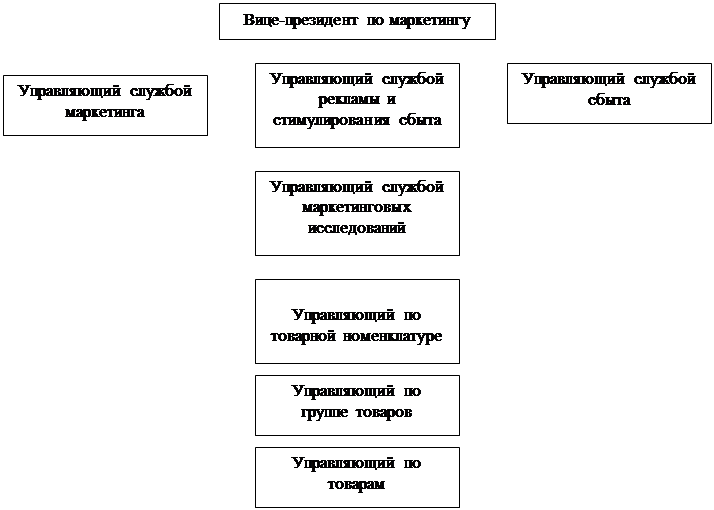 При создании отделов маркетинга чаще всего встречается вариант функциональной организации, при которой ответственность за выполнение каждой отдельной маркетинговой функции несет собственный управляющий, подчиняющийся вице-президенту по маркетингу. Организация по географическому принципу позволяет торговым агентам сконцентрировать свои усилия на конкретном географическом рынке. Еще один вариант-организация по товарному производству, при которой производством каждого отдельного товара руководит собственный управляющий, сотрудничающий со специалистами остальных функциональных служб. Следующий вариант-организация по рыночному принципу, при которой основные рынки закрепляют за управляющими по рынкам. Ряд крупных фирм используют организацию по товарно-рыночному принципу.