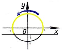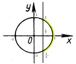 Эта прямая разделила окружность на две дуги. Выделим ту из них, на которой изображаются числа, имеющие косинус больший, чем