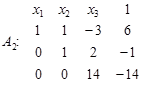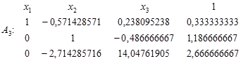 Помножимо другий рядок на 0,571428571 і додамо до першого рядка; далі помножимо другий рядок на 2,714285716 і додамо до третього: