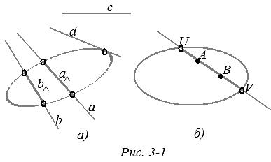 V*. Возьмем произвольную прямую UVи точку А, не лежащую на ней. Рассмотрим прямые UU1 и VV1 , проходящие через точку А (рис. 3). Эти прямые не пересекаются с прямой UV, так как евклидовы точки Uи Vне являются неевклидовыми точками прямой UV. Таким образом, имеет место аксиома V* Лобачевского.
