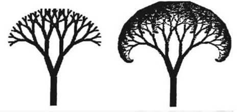 На рисунке 1 представлено фрактальное дерево, созданное с помощью компьютера английским ученым Майклом Бэтти. Каждая веточка дерева разделяется на две, чтобы в итоге создать фрактальный купол. Иллюстрация слева представляет шесть итераций или ветвлений. На тринадцатой итерации (иллюстрация справа) дерево приобретает уже более реалистические черты. Рекурсивное моделирование может генерировать различные разновидности деревьев с помощью изменения фрактального числа. Фрактальные деревья иллюстрируют тот факт, что фрактальная геометрия - мера изменений. Каждое разветвление дерева, каждый изгиб на реке, каждое изменение направления рынка - точка принятия очередного решения [19].