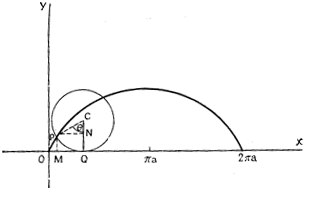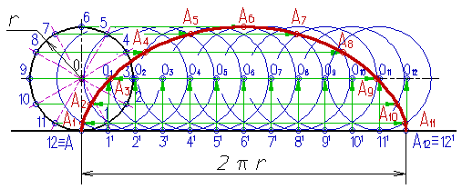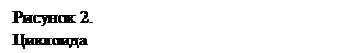 Циклоида – простейшая кривая, которую описывает точка окружности, катящейся по неподвижной прямой. Эта кривая имеет бесконечно много точек возврата, описываемых точкой, когда катящаяся кривая опускает ее на прямую, а затем вновь поднимает с прямой (рис.2)