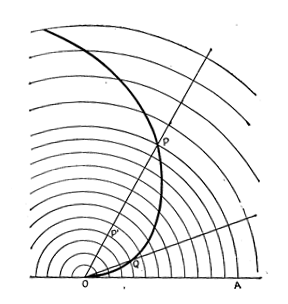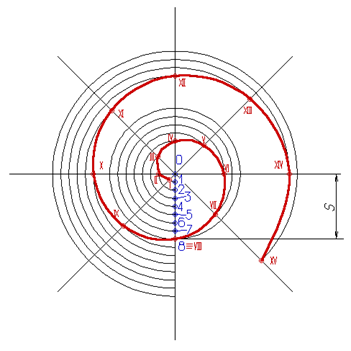 Спираль Архимеда состоит из бесконечно многих витков. Она начинается в центре циферблата и все более и более удаляется от него по мере того, как растет число оборотов. На рис.4 изображены первый виток и часть второго [20].