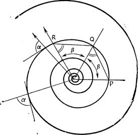 Предположим, что точки Р, Q, R ... размещены на спирали через равные угловые промежутки (все углы QОР, RОQ, ... равны одной и той же величине β). Тогда OQ/ ОР == еβ ctg a == OR/OQ = ..., поэтому в треугольниках ОРQ, OQR, ... углы при вершине О равны и отношение сходственных сторон остается неизменно. По теореме из «Начал» Евклида все эти треугольники подобны. Следовательно, углы ОQР, ОRQ, ... равны. Пользуясь одним лишь этим свойством, можно доказать, что касательная в любой точке Р логарифмической спирали образует постоянный угол с радиус-вектором ОР.