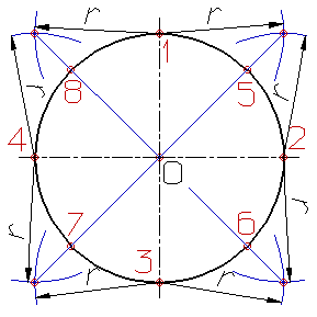 Применяя известный прием деления прямого угла на две равные части при помощи циркуля или угольника строят биссектрисы прямых углов, которые, пересекаясь с окружностью в точках 5, 6, 7, и 8 делят каждую четвертую часть окружности пополам.