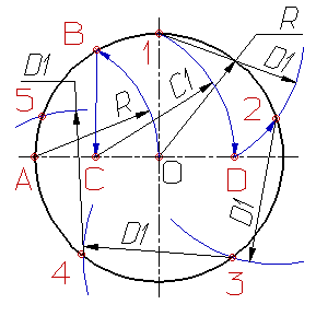 Проводят две перпендикулярные оси, которые пересекая окружность в точках 1, 2, 3, 4 делят ее на четыре равные части;