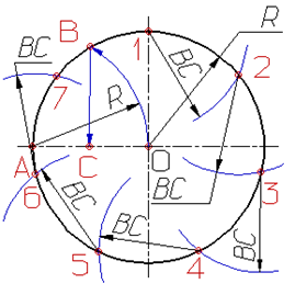 Деление окружности на равные части, достаточно распространенное геометрическое построение, основывается на законах симметрии, а именно является примером поворотной симметрии [1;7].